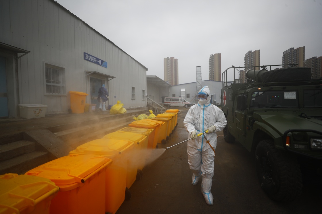 在武汉火神山医院,洗消分队队员对医疗垃圾进行洗消作业(2月26日摄)。