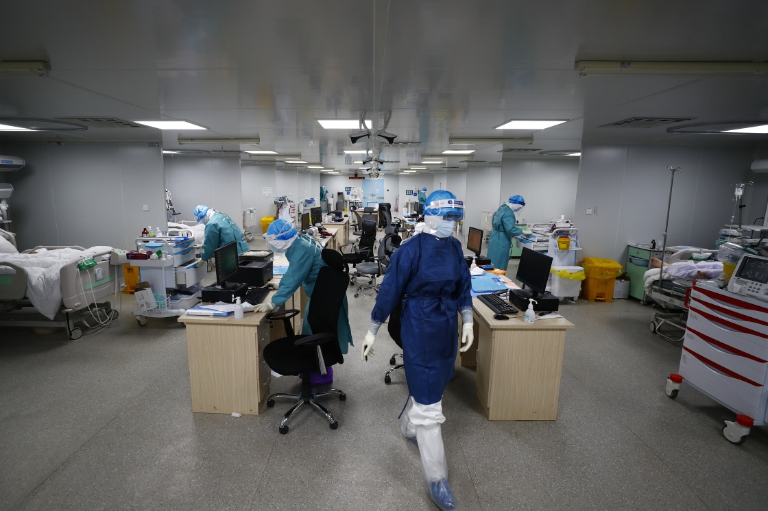在武汉火神山医院,重症一科医护人员紧张忙碌(2月24日摄)。