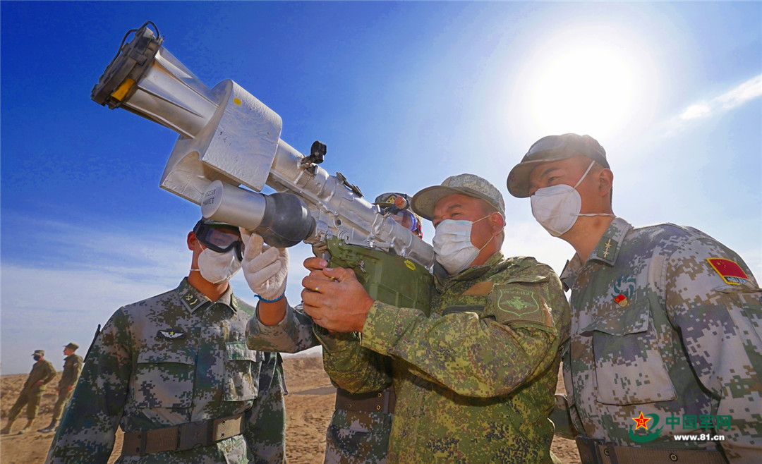 俄军向中方参演官兵示范讲解某型防空导弹瞄准射击要领。