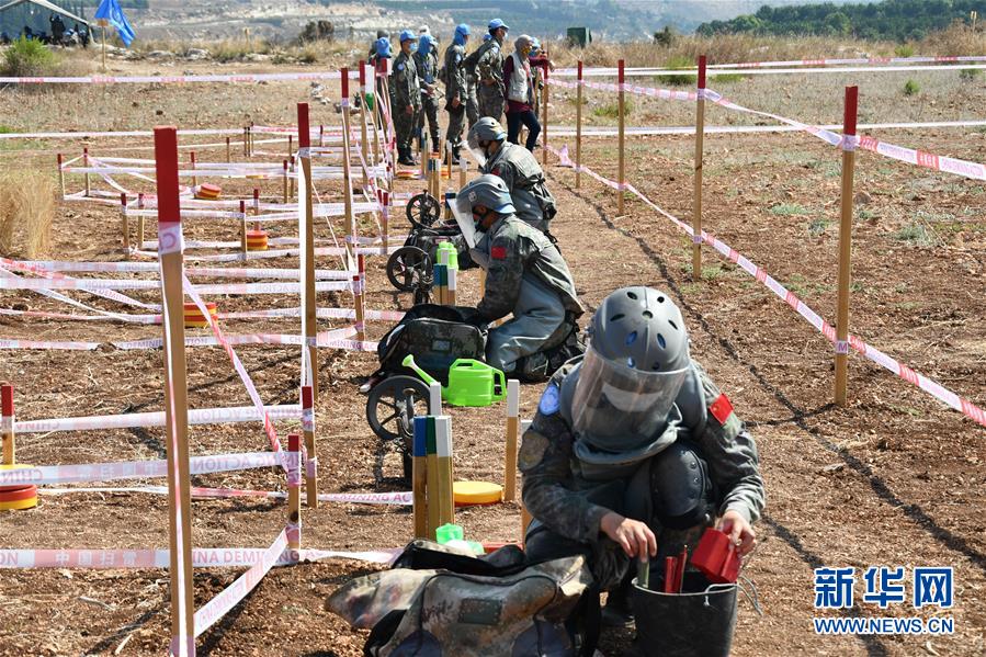 9月14日,在黎巴嫩南部辛尼亚村的扫雷训练场,中国扫雷官兵在考核现场严阵以待。 经过连续3天考核,中国第19批赴黎巴嫩维和多功能工兵分队9月16日通过了联合国地雷行动中心的资质认证。这是中国军队自2006年赴黎执行维和任务以来,首次同时获得军事扫雷与人道主义扫雷两种资质。 新华社发(丁文栋摄)