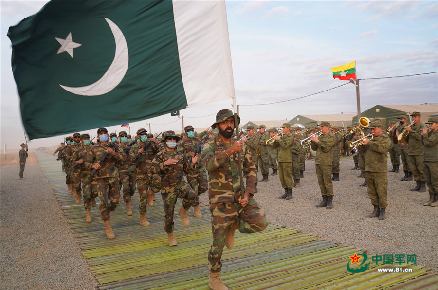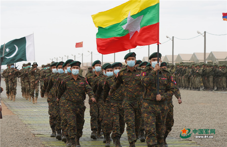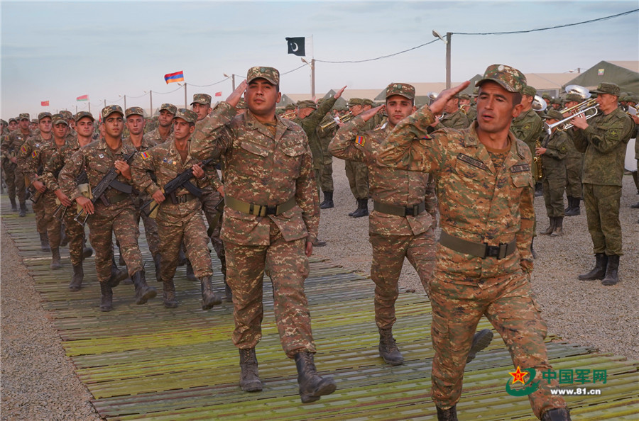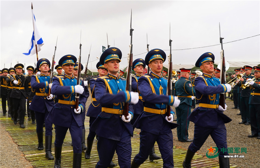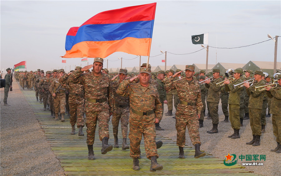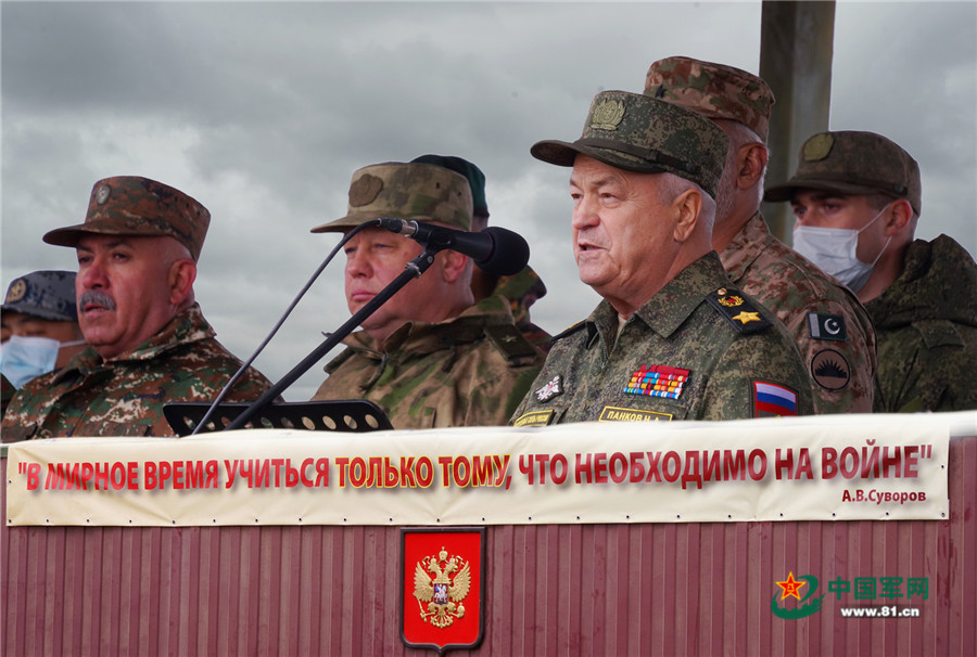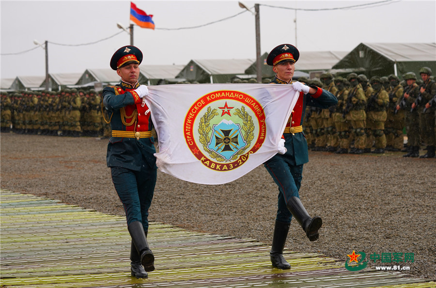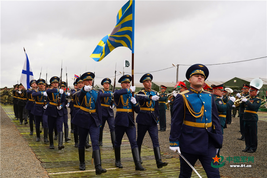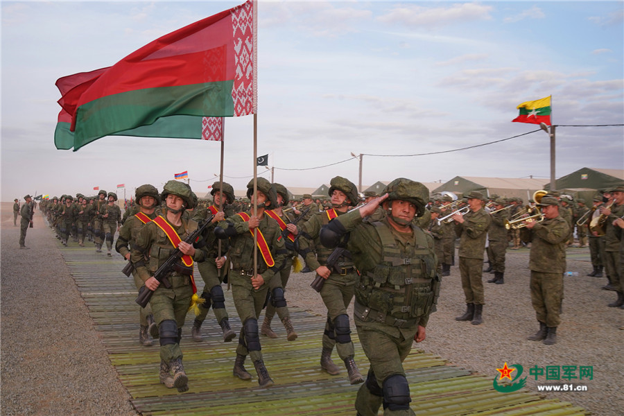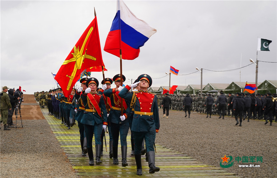 当地时间9月19日12时,俄罗斯阿斯特拉罕州卡普斯京亚尔靶场上礼炮齐鸣、战鹰翱翔,在俄罗斯军乐团的伴奏下,来自俄罗斯、中国、白俄罗斯、亚美尼亚、缅甸和巴基斯坦等国参演部队整齐列阵,英姿飒爽地通过检阅台,标志着“高加索-2020”战略演习正式拉开大幕。