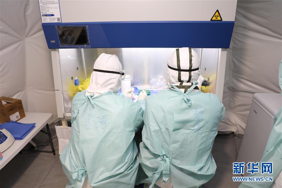 姜涛博士(左)和黎浩博士(右)在搭建的负压帐篷实验室开展核酸检测(1月31日摄)。新华社发(张振威 摄)
