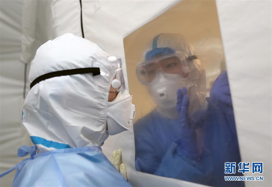 军事科学院军事医学专家组成员在负压帐篷实验室隔着缓冲门进行交流(3月23日摄)。新华社发(张振威 摄)