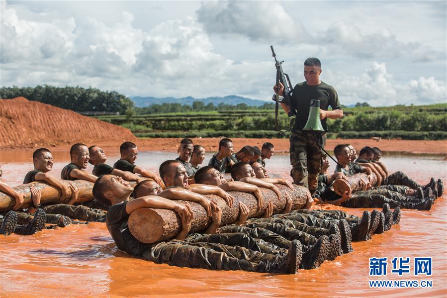 武警云南总队某支队机动一中队开展体能强化训练,官兵在泥潭中托举圆木(7月4日摄)。 新华社发 (胡程 摄)