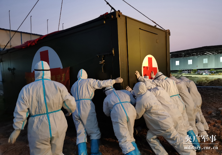 科研人员在火神山医院连夜展开装备。(邵龙飞 摄)
