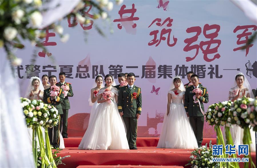 9月25日,武警宁夏总队第二届“强军有你,真情相拥”集体婚礼在银川举行。在国庆和中秋佳节来临之际,20对新人在亲属和战友的祝福下步入婚姻殿堂。 新华社记者 冯开华 摄