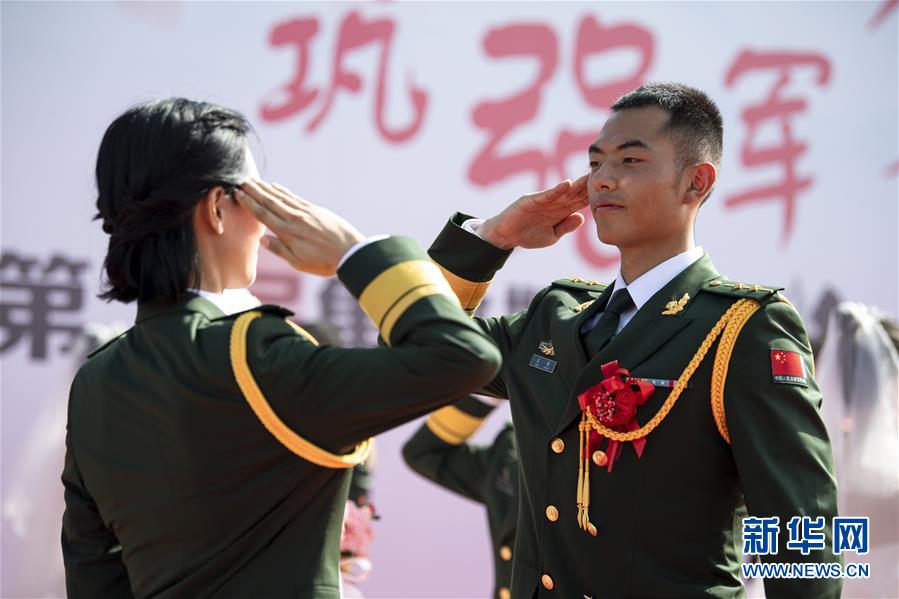 9月25日,一对新人在集体婚礼现场互敬军礼。 当日,武警宁夏总队第二届“强军有你,真情相拥”集体婚礼在银川举行。在国庆和中秋佳节来临之际,20对新人在亲属和战友的祝福下步入婚姻殿堂。 新华社记者 冯开华 摄
