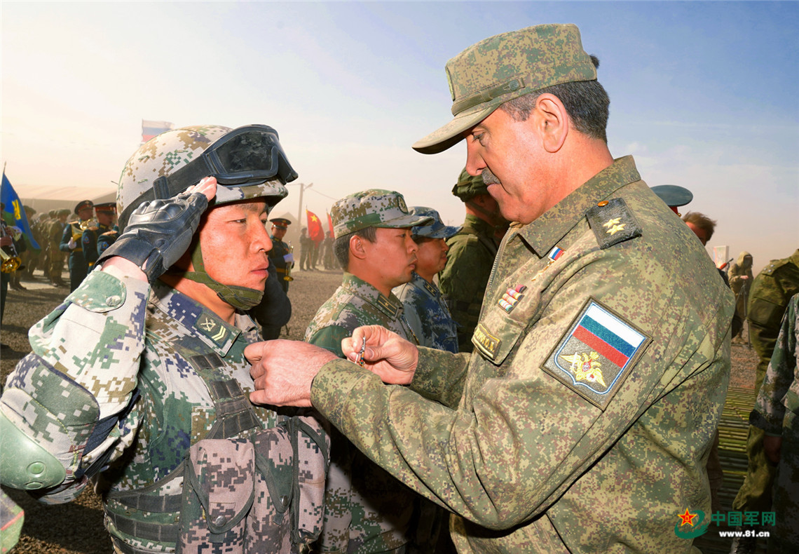 俄罗斯国防部副部长叶夫库罗夫中将向中方参演官兵颁发勋章。