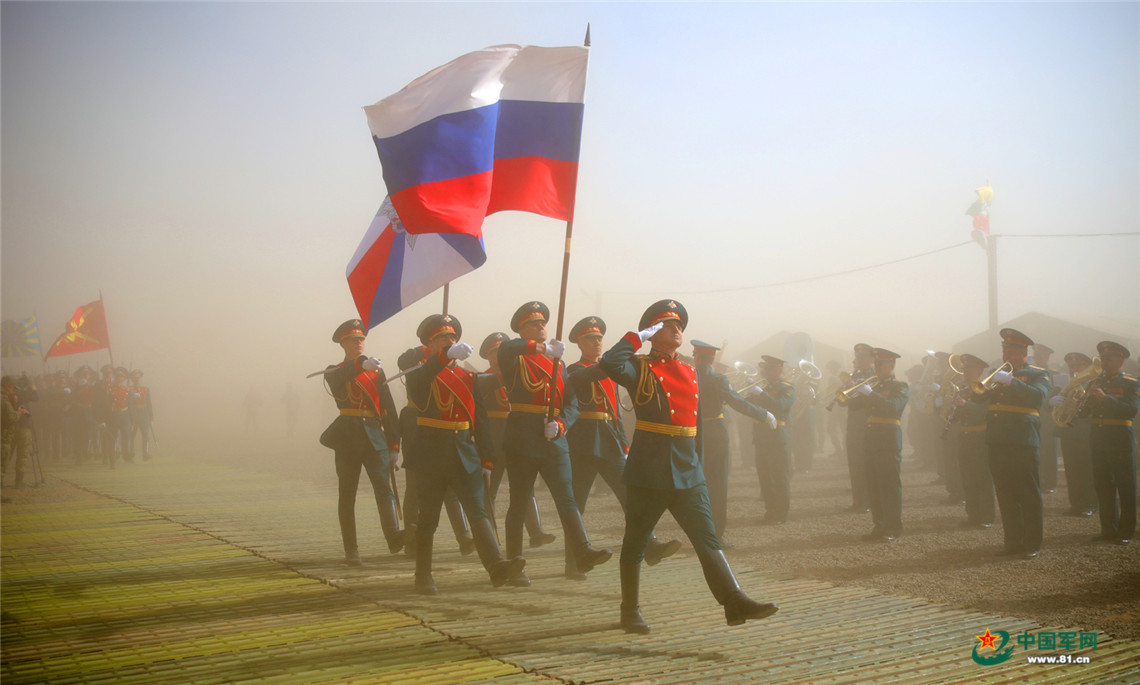 俄方参演部队受阅方队通过阅兵台。