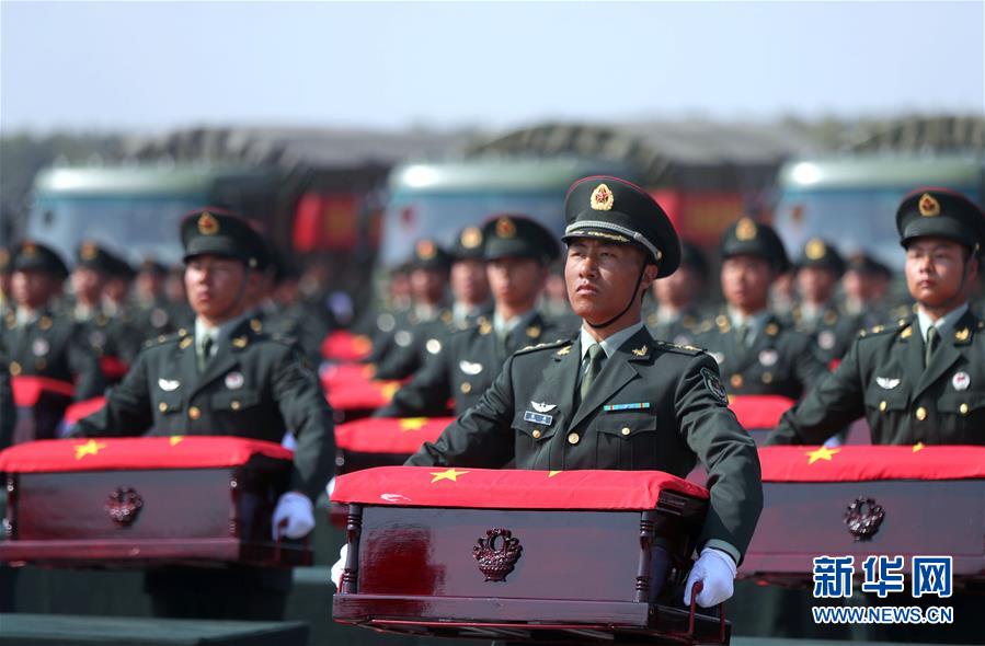 9月27日,在沈阳桃仙国际机场,礼兵将殓放志愿军烈士遗骸的棺椁从专机上护送至棺椁摆放区。 当日,第七批在韩中国人民志愿军烈士遗骸由中国空军专机护送从韩国接回辽宁沈阳。机上共载有117位志愿军烈士的遗骸及相关遗物。 新华社记者 杨青 摄