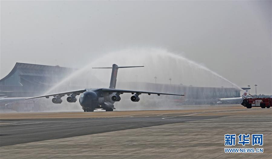 9月27日,在沈阳桃仙国际机场,运送志愿军烈士遗骸的空军专机通过水门。 当日,第七批在韩中国人民志愿军烈士遗骸由中国空军专机护送从韩国接回辽宁沈阳。机上共载有117位志愿军烈士的遗骸及相关遗物。 新华社记者 杨青 摄