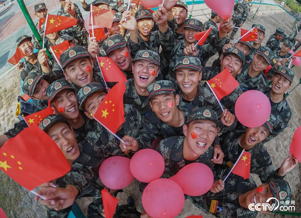 图为战士们手拿国旗、气球欢呼祝福祖国。(张丹)