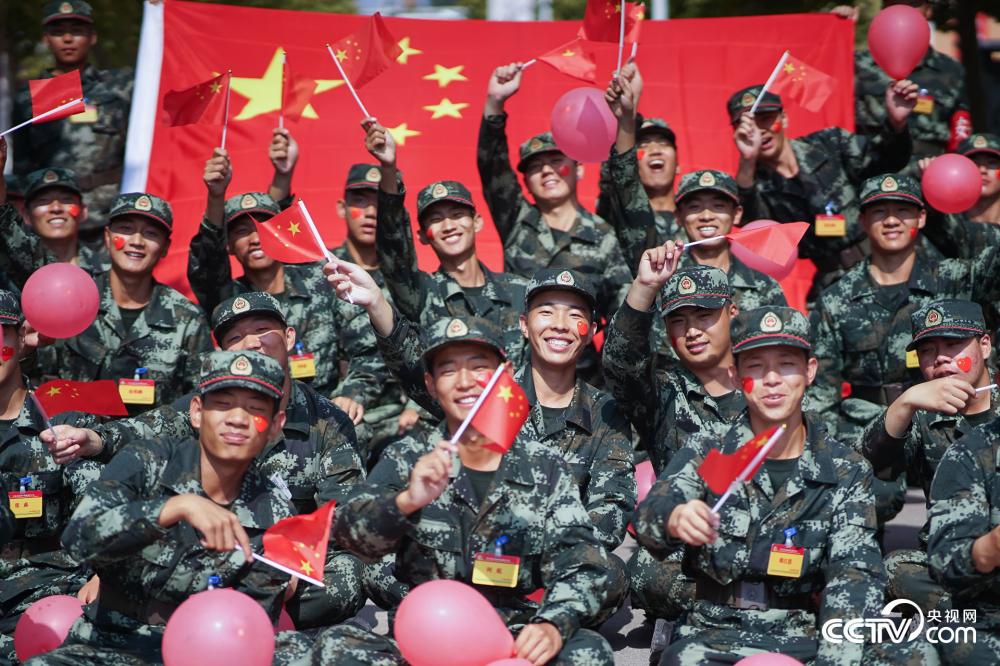 图为战士们手拿气球、国旗欢呼祝福祖国。(张丹)