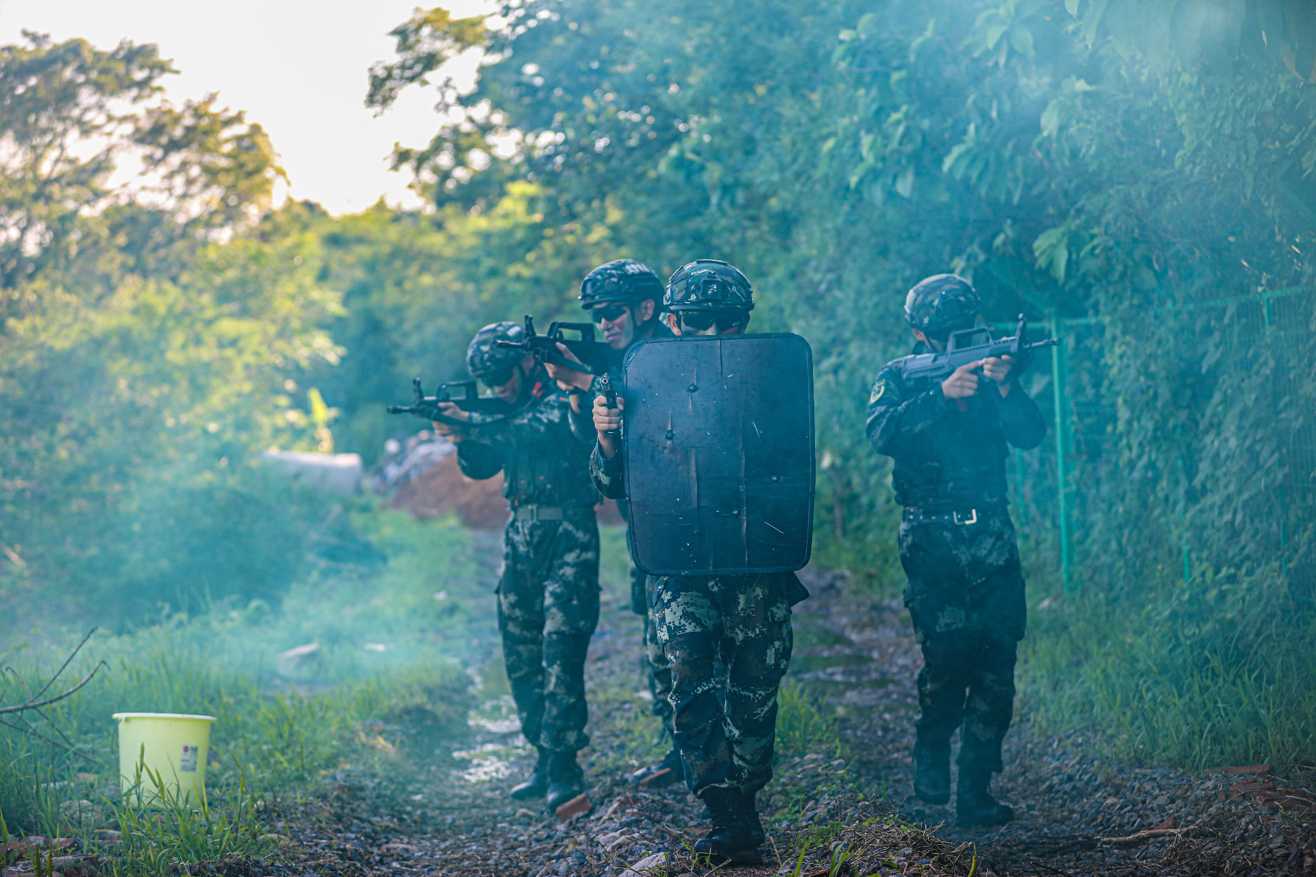 图为武警官兵利用烟雾掩护前进。