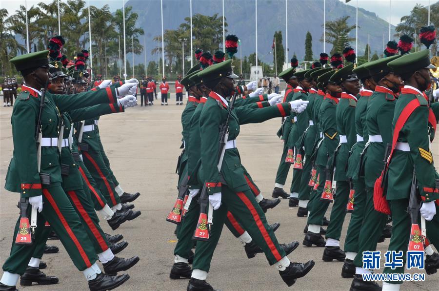 10月1日,在尼日利亚首都阿布贾,仪仗队士兵参加阅兵活动。 当日,尼日利亚举行阅兵活动,庆祝独立60周年。 新华社发(戴维·奥马 摄)
