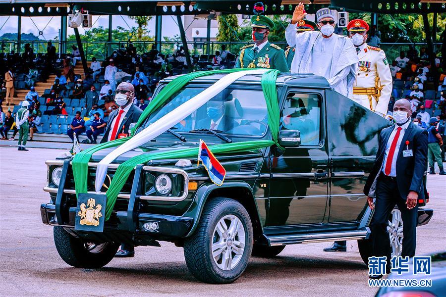 10月1日,在尼日利亚首都阿布贾,尼日利亚总统布哈里在阅兵活动上(上中)检阅仪仗队。 当日,尼日利亚举行阅兵活动,庆祝独立60周年。 新华社发(戴维·奥马 摄)
