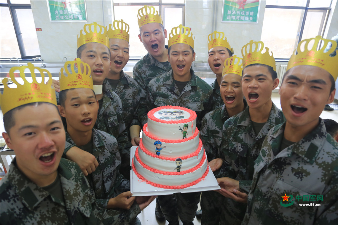 午饭时,一首熟悉的生日歌曲突然响起,十月过生日的战友们带着生日帽,伴着战友们的掌声和歌声,走入饭堂。