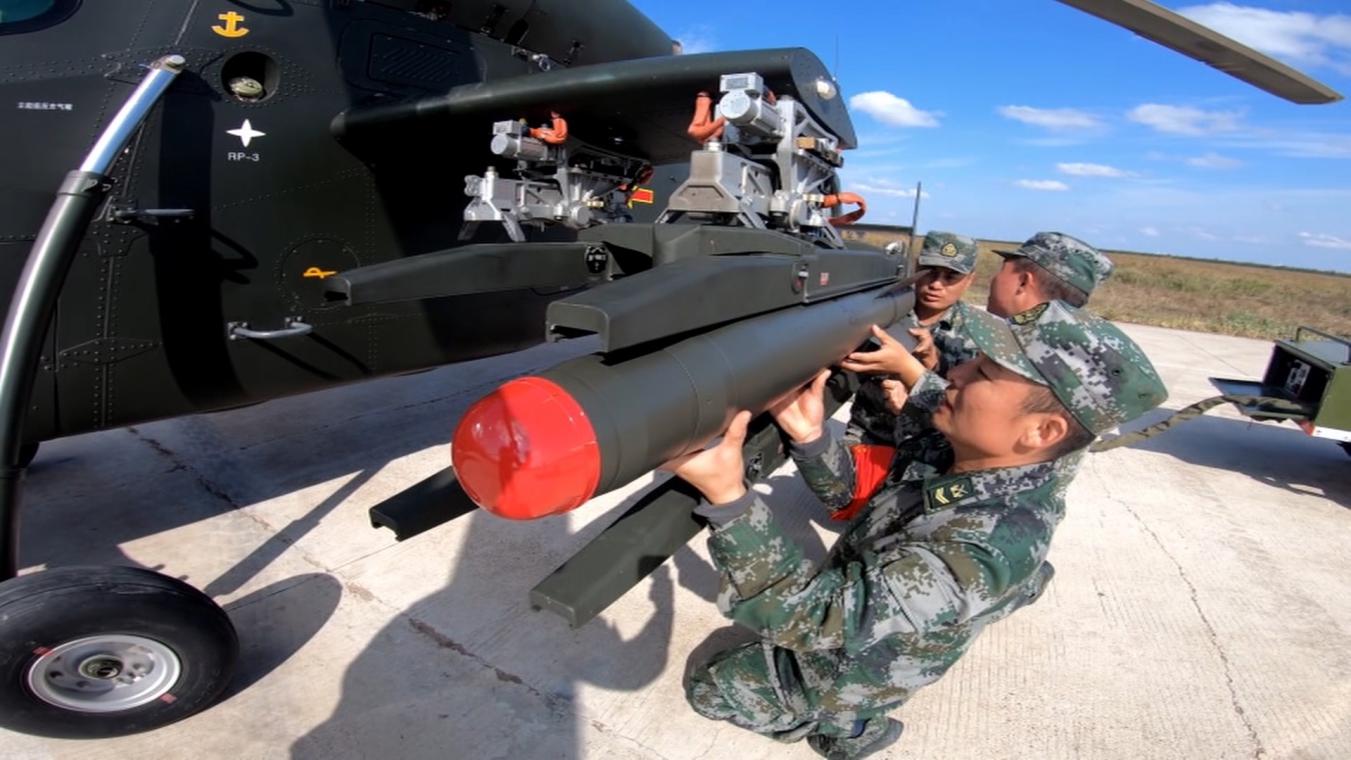 军械人员为直升机挂载空地导弹。
