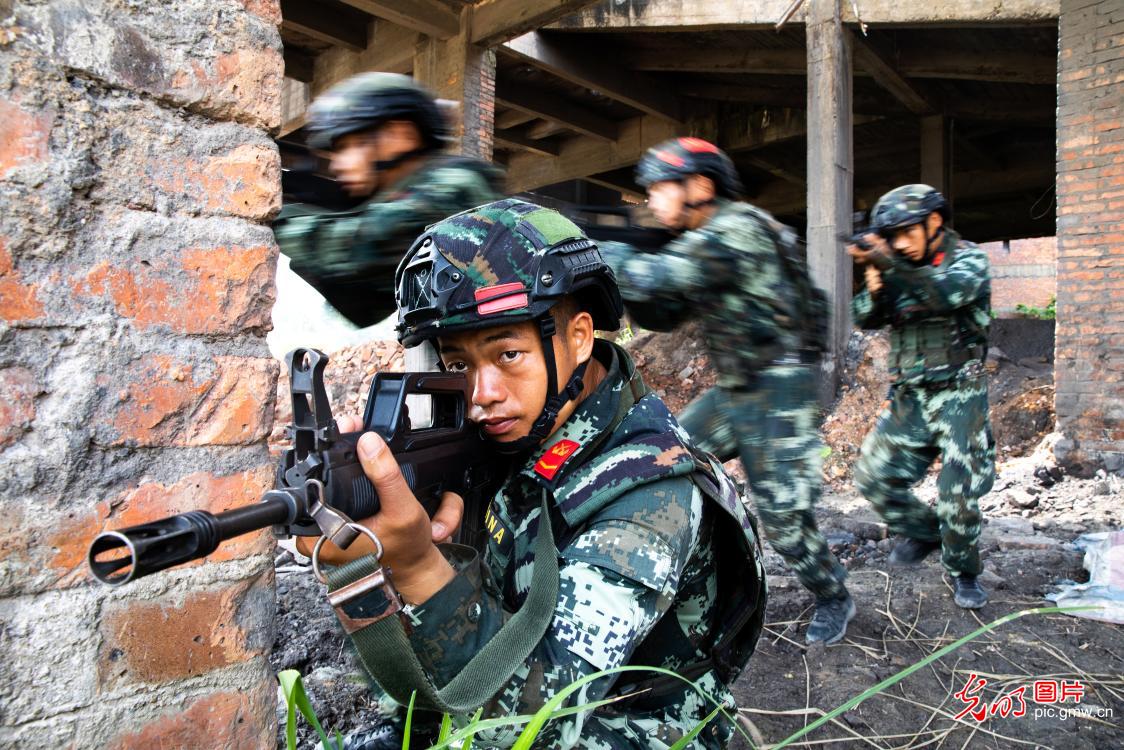 2020年10月11日,武警特战队员协同搜索。武警广西总队钦州支队组织特战队员进行楼房反劫持、极限体能、(技)战术等课目训练,进一步锤炼特战队员综合素质能力。(柴浩摄/光明图片)