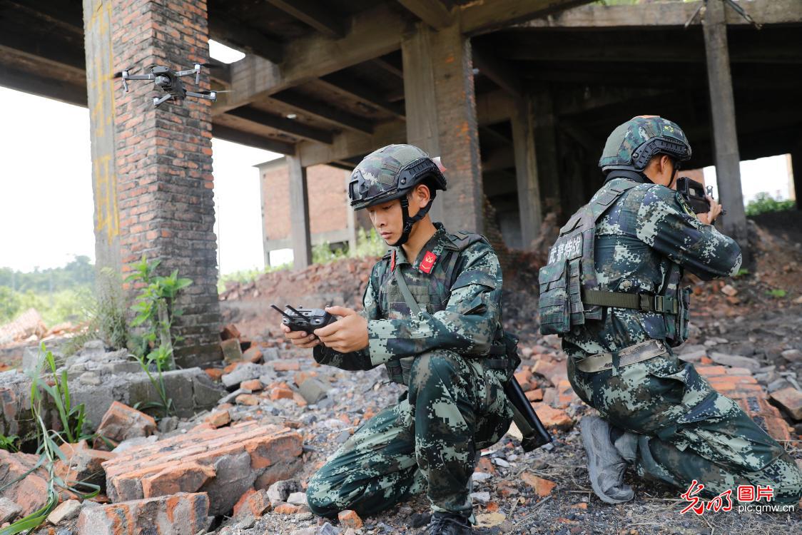 2020年10月11日,武警特战队员利用无人机进行侦察。武警广西总队钦州支队组织特战队员进行楼房反劫持、极限体能、(技)战术等课目训练,进一步锤炼特战队员综合素质能力。(柴浩摄/光明图片)