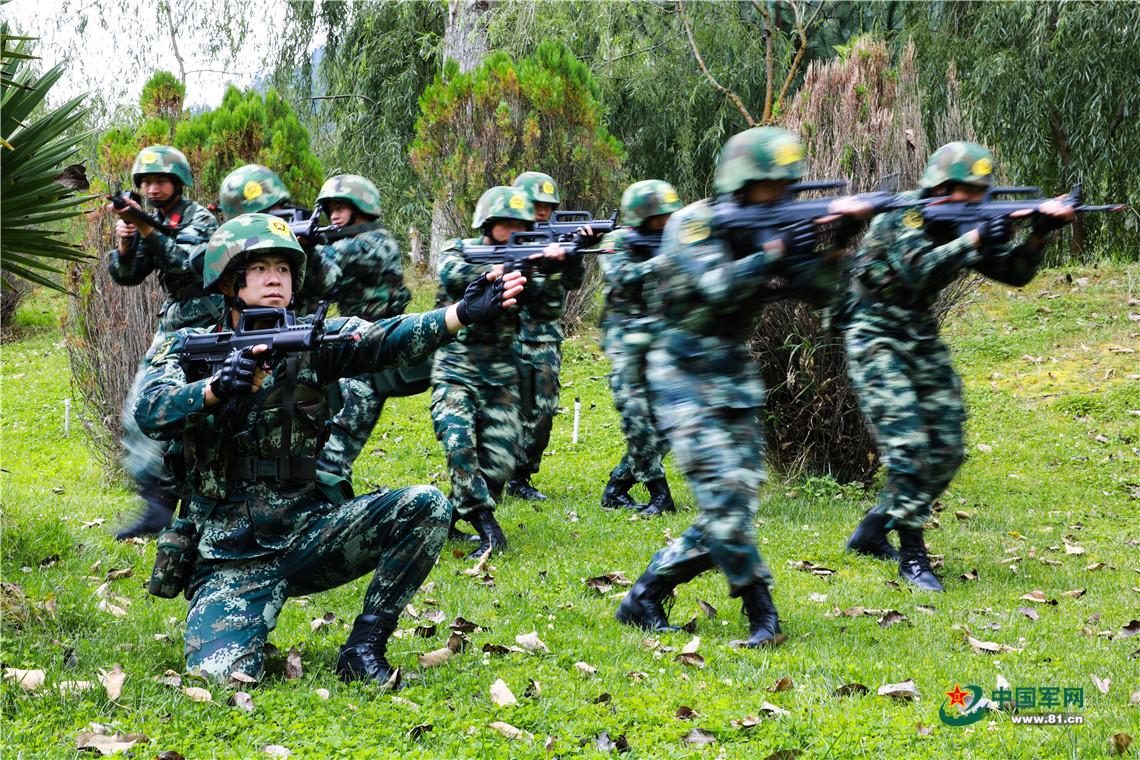 官兵正在开展丛林搜索战术训练。陆文凯 摄
