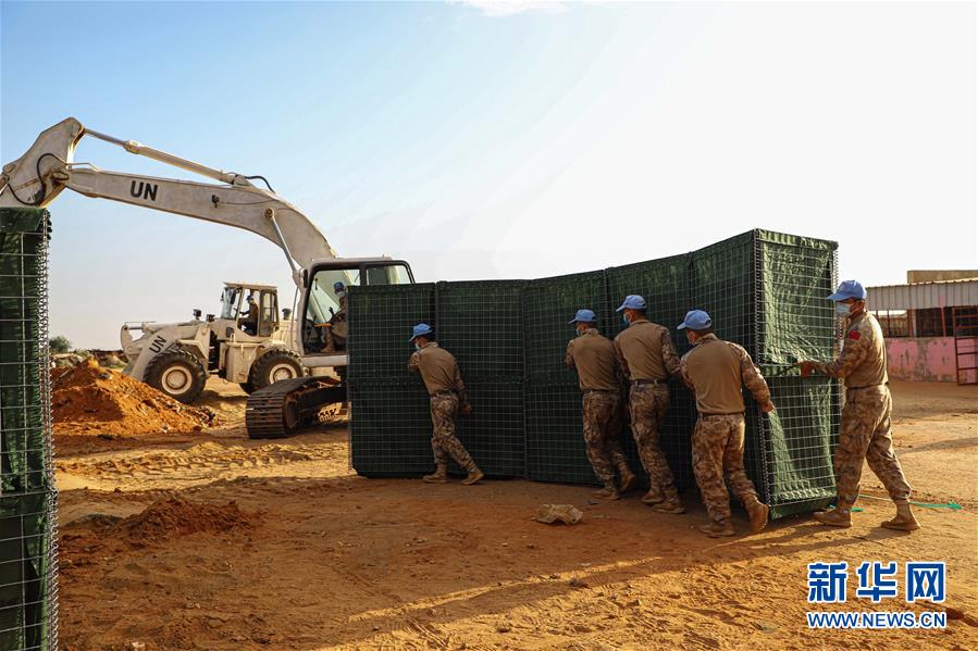 中国第16批赴苏丹达尔富尔维和工兵分队18日圆满完成联合国和非洲联盟驻达尔富尔联合特派团(联非达团)法希尔超级营地防御工事升级改造任务,此举有效提升了营地应对突发安全风险的防卫能力。10月8日,中国维和工兵分队在法希尔超级营地搭设防御沙箱。 新华社发(徐绍钢摄)