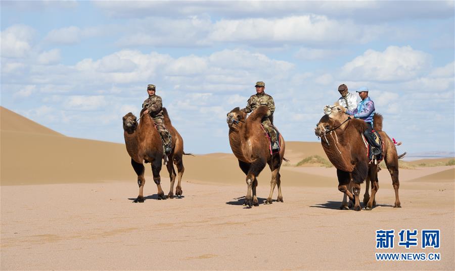 10月15日,阿拉善右旗边防民兵驼兵排民兵和当地牧民进行骆驼应用训练。 当日,阿拉善右旗边防民兵驼兵排联合阿拉善边境管理支队民警和当地牧民,在位于内蒙古阿拉善右旗的巴丹吉林沙漠北部进行骆驼应用训练演练,实地检验了当地民兵和民警在沙漠腹地执行巡护任务的能力。 新华社记者 连振 摄