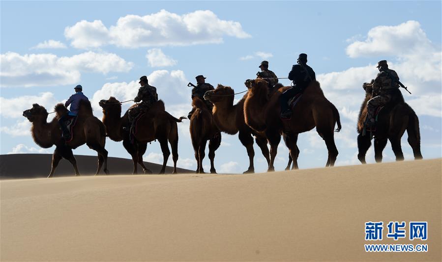 10月15日,阿拉善右旗边防民兵驼兵排和当地牧民进行骆驼应用训练。 当日,阿拉善右旗边防民兵驼兵排联合阿拉善边境管理支队民警和当地牧民,在位于内蒙古阿拉善右旗的巴丹吉林沙漠北部进行骆驼应用训练演练,实地检验了当地民兵和民警在沙漠腹地执行巡护任务的能力。 新华社记者 连振 摄