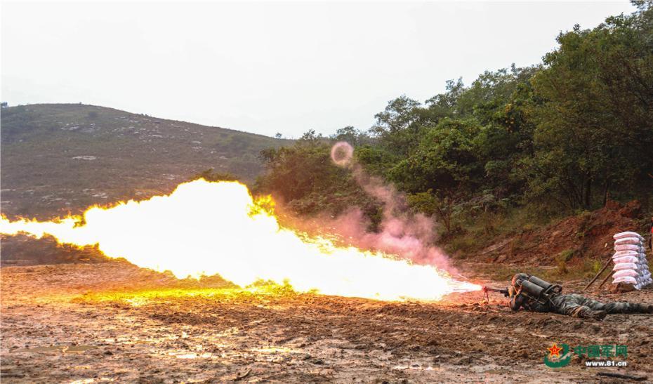 近日,第71集团军某合成旅组织开展喷火器实喷训练,从严从难锤炼官兵过硬作战能力。图为“火龙”直奔目标靶喷涌而去。钟宇清 摄 图片来源:中国军网