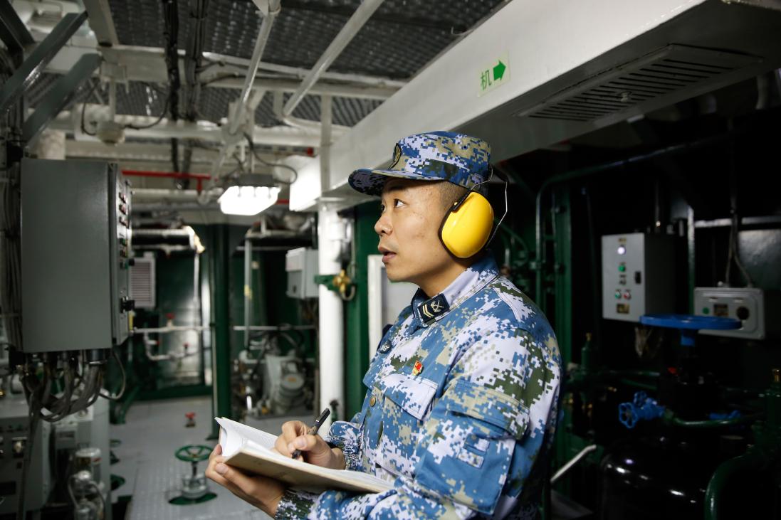 海军毕昇舰辅机班长检拭舰艇辅机运行状态并记录数据(4月14日摄)。新华社发(李俣默 摄)
