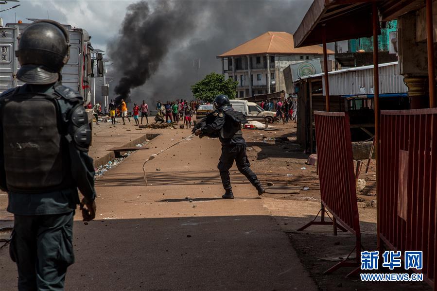 10月21日,在几内亚科纳克里市郊,反对派支持者与警察发生冲突。