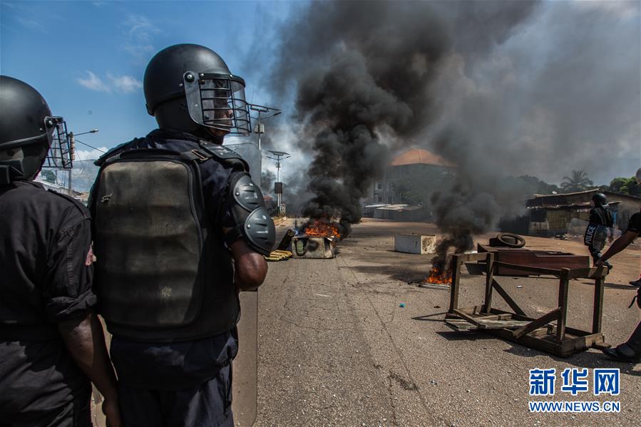 10月21日,在几内亚科纳克里市郊,反对派支持者竖起路障、焚烧轮胎和桌椅等用品。新华社发(埃迪·皮特斯摄)