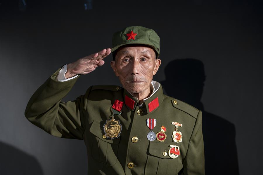 在重庆市拍摄的志愿军老战士易禄亨(9月29日摄)。 易禄亨,1936年生,重庆涪陵人,1951年随部队入朝。1952年10月,易禄亨随部队参加战备训练时遭敌机轰炸,他跑进村里,从火海中抢救朝鲜群众,被朝鲜军民誉为“中国好儿女”。因在战场上的突出表现,易禄亨荣立一等功1次。 新华社记者 刘潺 摄
