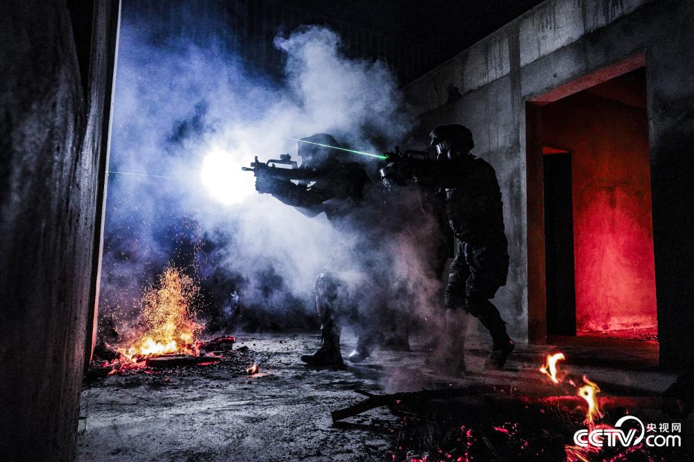 图为特战队员夜间对模拟街区进行搜索。(张文、陈戈)