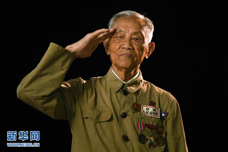 在湖南省岳阳市拍摄的志愿军老战士朱再保(10月2日摄)。 朱再保,1928年生,湖南岳阳人,1951年参加抗美援朝战争。1953年7月,金城战役打响,朱再保右膝盖受伤,他带伤坚持参战15天,顺利完成任务并火线入党。 新华社记者 薛宇舸 摄