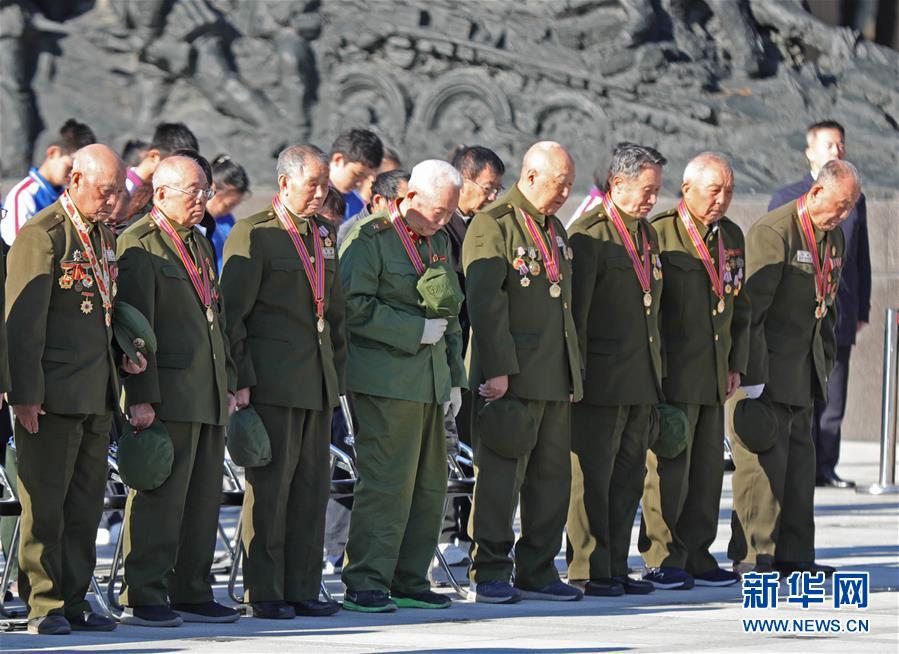 10月23日,在辽宁沈阳抗美援朝烈士陵园敬献花篮仪式上,志愿军老战士、老同志代表向烈士默哀。 新华社记者 杨青 摄