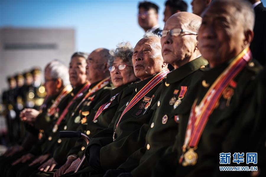 10月23日,在丹东抗美援朝纪念塔敬献花篮仪式上,志愿军老战士、老同志代表在缅怀烈士。 新华社记者 潘昱龙 摄