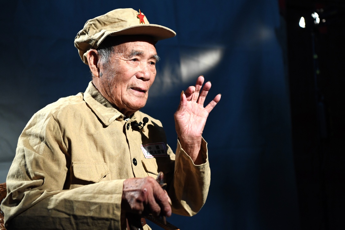在广西平乐县,志愿军老战士贲国宣回忆战火纷飞的岁月。他因在战争中负伤致左手食指扭曲变形(9月24日摄)。新华社记者 周华 摄