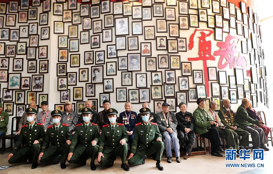 10月25日,参加活动的武警战士与志愿军老战士们在志愿军战士照片墙前合影。 当日,致敬最可爱的人——纪念中国人民志愿军抗美援朝出国作战70周年活动在上海志愿军文献馆举行。 新华社记者 方喆 摄