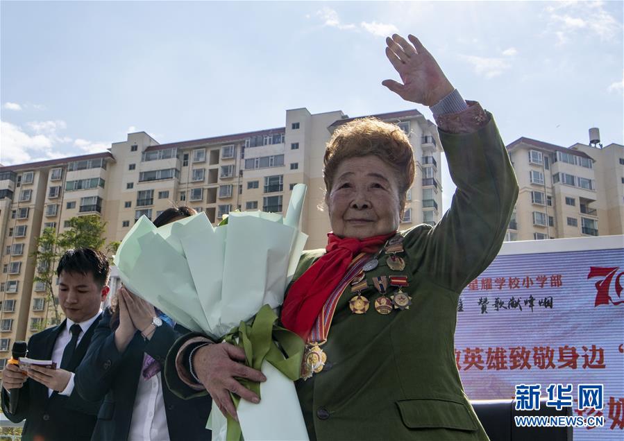 10月26日,抗美援朝老战士杨秀珍在主题活动上接受学生献花。 当日,90岁的抗美援朝老战士杨秀珍来到位于昆明市官渡区的云大附中星耀学校小学部,与师生们一同参加纪念中国人民志愿军抗美援朝出国作战70周年主题活动,为学生们讲述抗美援朝时的经历,鼓励同学们从小树立正确的人生观和爱国主义情怀,努力学习报效祖国。 新华社记者 江文耀 摄