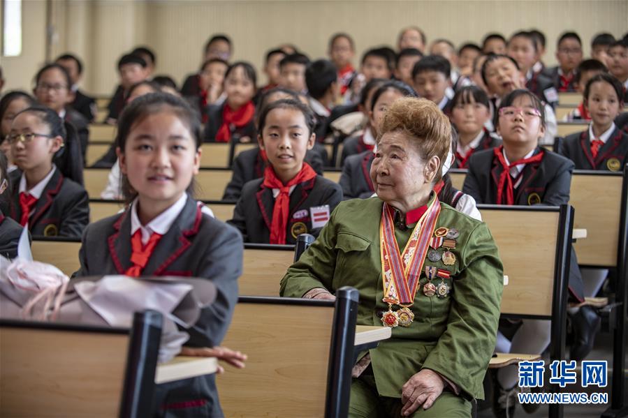 10月26日,抗美援朝老战士杨秀珍与云大附中星耀学校小学部师生一同参加抗美援朝英雄故事分享会。 当日,90岁的抗美援朝老战士杨秀珍来到位于昆明市官渡区的云大附中星耀学校小学部,与师生们一同参加纪念中国人民志愿军抗美援朝出国作战70周年主题活动,为学生们讲述抗美援朝时的经历,鼓励同学们从小树立正确的人生观和爱国主义情怀,努力学习报效祖国。 新华社记者 江文耀 摄