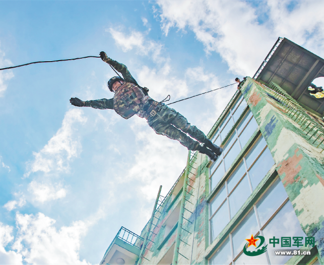 连日来,武警广西总队南宁支队开展攀登、索降等课目强化训练,锤炼特战队员单兵技战术。图为特战队员进行飞身下滑训练。解放军报特约通讯员 余海洋摄
