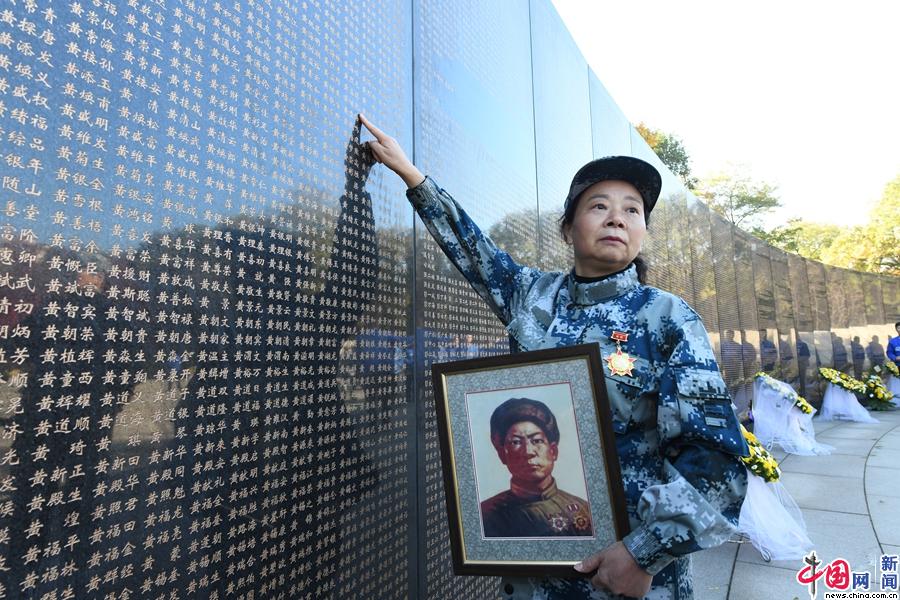 黄继光侄女黄英在英烈墙前寻找黄继光的姓名。