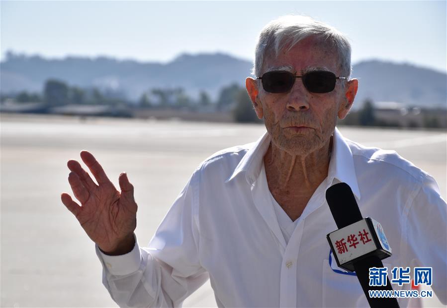 10月30日,莫耶在美国加利福尼亚州圣路易斯-奥比斯波机场接受新华社记者采访。 76年前,哈里·莫耶驾驶P-40战机和“飞虎队”战友们一道在中国上空扫荡日寇飞机。30日,期颐之年的莫耶驾驶一架民用小型飞机在美国加利福尼亚州圣路易斯-奥比斯波机场再次冲上蓝天,庆祝自己的百岁生日。 新华社发(曾慧 摄)