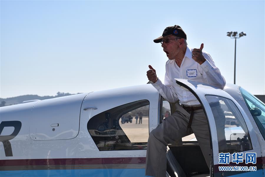 10月30日,在美国加利福尼亚州圣路易斯-奥比斯波机场,莫耶完成飞行降落后受到人群的欢迎。 76年前,哈里·莫耶驾驶P-40战机和“飞虎队”战友们一道在中国上空扫荡日寇飞机。30日,期颐之年的莫耶驾驶一架民用小型飞机在美国加利福尼亚州圣路易斯-奥比斯波机场再次冲上蓝天,庆祝自己的百岁生日。 新华社记者 高山 摄