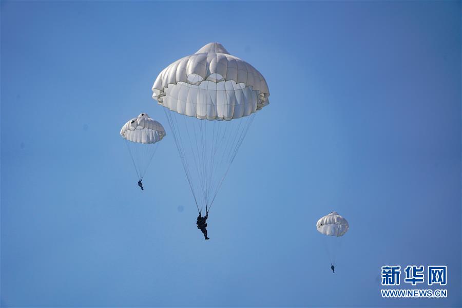 空降兵部队某旅进行大规模集群伞降训练,跳伞员在空中操纵降落伞向预定地域集结(9月8日摄)。 新华社发