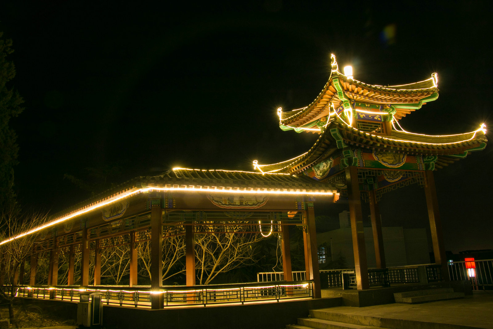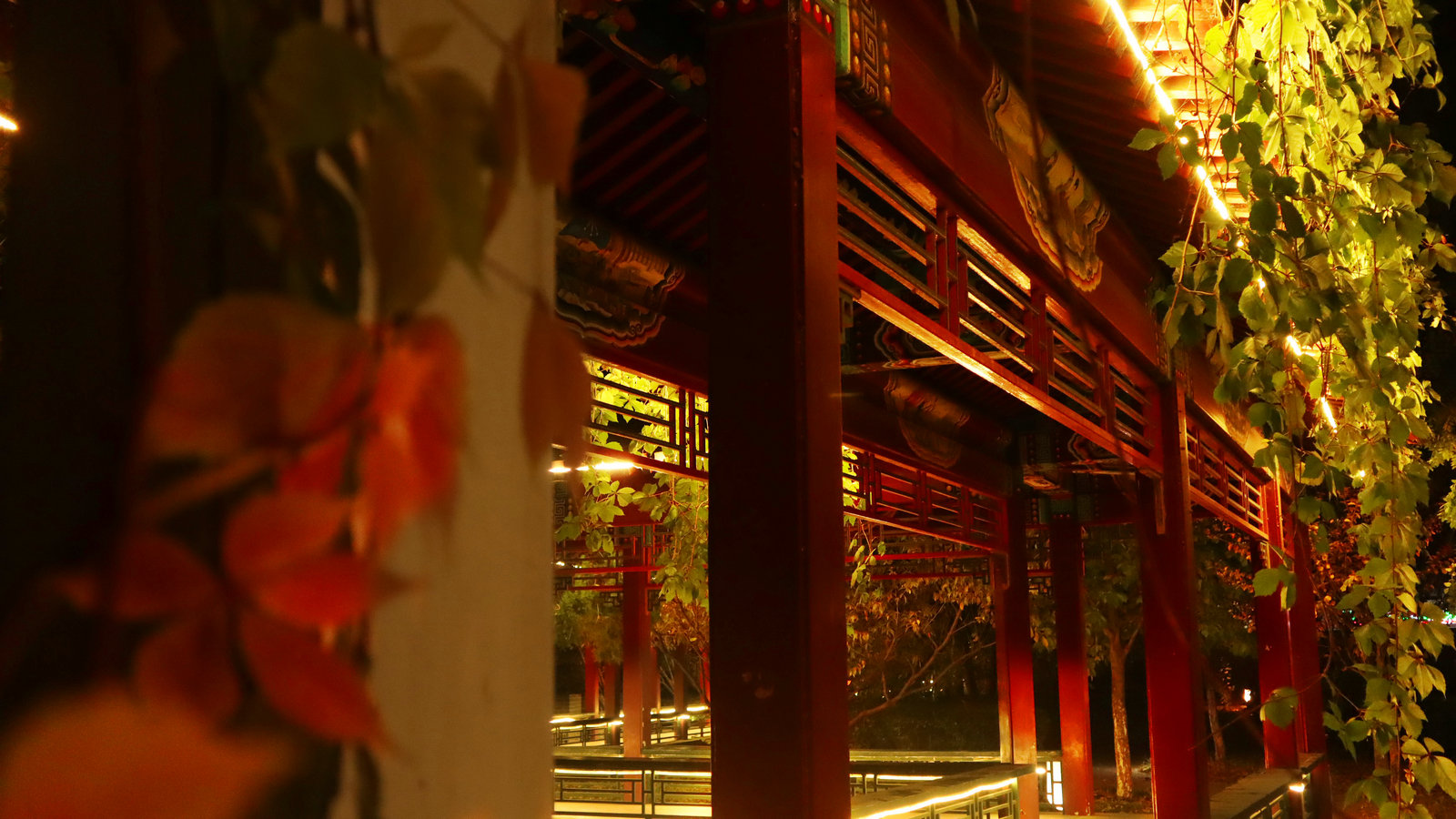 秋月宁静,微风轻柔,柔弱的月光与灯光融合一体,隐隐约约,朦朦胧胧,用光影描绘出长廊的轮廓。长廊上方爬满了藤蔓,明月透过缝隙投下星光,如同银河一般。