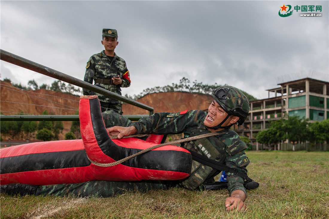 商士秀踉踉跄跄地到达搬运假人场地,平时轻轻松松拖起的100斤重假人,也花费了比训练多一倍的时间才完成搬运。