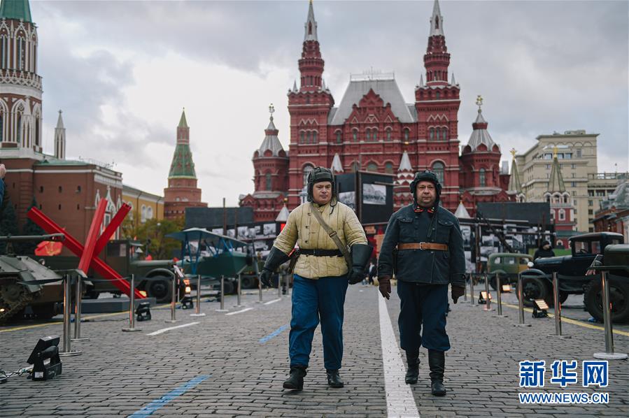 11月7日,在俄罗斯首都莫斯科,身着二战时期军装的志愿者在红场走过。 当日,俄罗斯在红场举行露天展览,纪念1941年苏联红场阅兵式。 新华社发(叶甫盖尼·西尼岑摄)