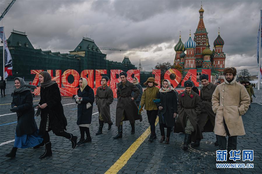 11月7日,在俄罗斯首都莫斯科,身着二战时期军装的志愿者在红场走过。 当日,俄罗斯在红场举行露天展览,纪念1941年苏联红场阅兵式。 新华社发(叶甫盖尼·西尼岑摄)